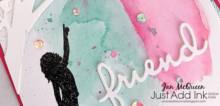 The base layer is Melon Mambo and the second almost hidden layer uses the Buffalo Check background stamp in Coastal Cabana. The top layer is of course water coloured and then some ink was flicked using the lid of the Aqua Painter to add a little detail. The pointing girl from Silhouette Scenes is embossed in the now retired Black Shimmery embossing powder and what looks to be white spots in the photo is in fact beautiful sparkles! To add to the sparkle the tree and "friend" are covered with liberal brush strokes of Wink of Stella.